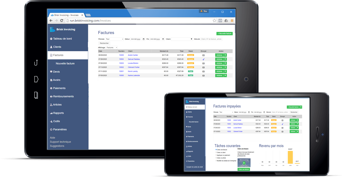 Assurez-vous que les factures sont payées à temps et en totalité. C’est la partie la plus importante de la facturation d’un client, en s’assurant que la facture est payée en totalité et à temps. La saisie des paiements prend quelques secondes et les mises à jour instantanées de vos comptes clients permettent de voir facilement quels comptes sont payés en totalité et quels comptes ont des soldes impayés. Notre système de code couleur vous aide à voir en un coup d’œil si une facture est en règle ou en retard, ce qui vous aide à évaluer votre flux de trésorerie.