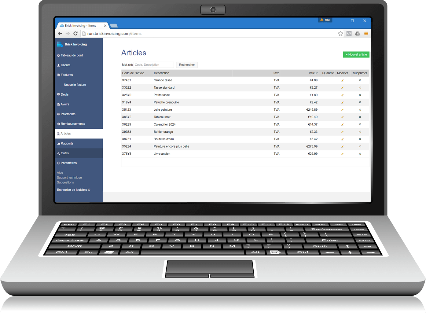 La facturation pour le même article plusieurs fois est facile. Brisk Invoicing enregistre automatiquement les nouveaux articles et leur coût dans votre liste d’articles lorsque vous les ajoutez à une facture. Vous pouvez également créer de nouveaux articles à partir de votre liste d’articles, puis y accéder à partir de votre facture. Attribuez un code d’article, une description, une valeur et un taux de taxe. Vous pouvez également modifier un article à tout moment pour refléter les modifications apportées à votre inventaire.